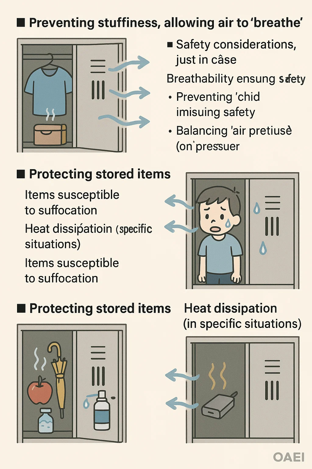 통기성은 안전을 보장합니다(가장 중요한 이유 중 하나). 이는 매우 중요합니다! 어린이가 잘못된 행동을 하거나 실수로 사물함 안에 자신을 잠그는 경우(드물지만 이는 설계 고려사항임), 이러한 작은 구멍은 공기 흐름을 보장하고 질식을 방지합니다. 구멍이 없이 완전히 밀폐된 공간은 매우 위험합니다.